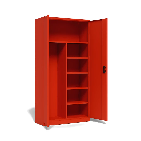 Office and clothing cabinet with hinged doors is divided into two sections: