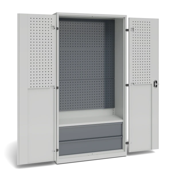 Workshop cabinet with 3 perforated panels, 1 permanently fixed shelf, 2 drawers 200 mm high, perforated panel on the doors