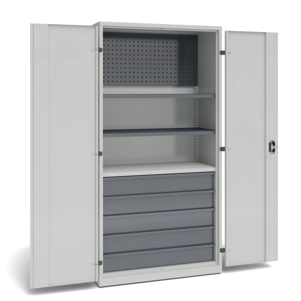 Workshop cabinet with full hinged doors, perforated panel, 2 adjustable shelves, 1 permanently fixed shelf, 5 drawers 150 mm high