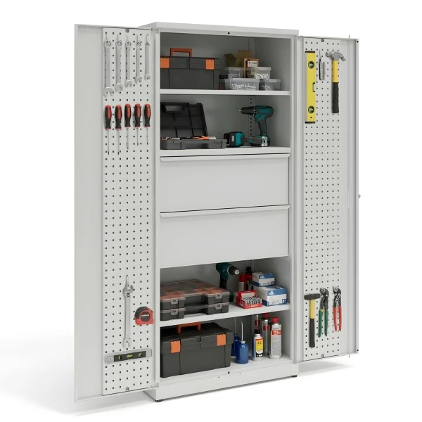 Szafa narzędziowa z 2 półkami przestawnymi, 2 szufladami wys. 300mm i panelami perforowanymi na drzwiach (kopia)