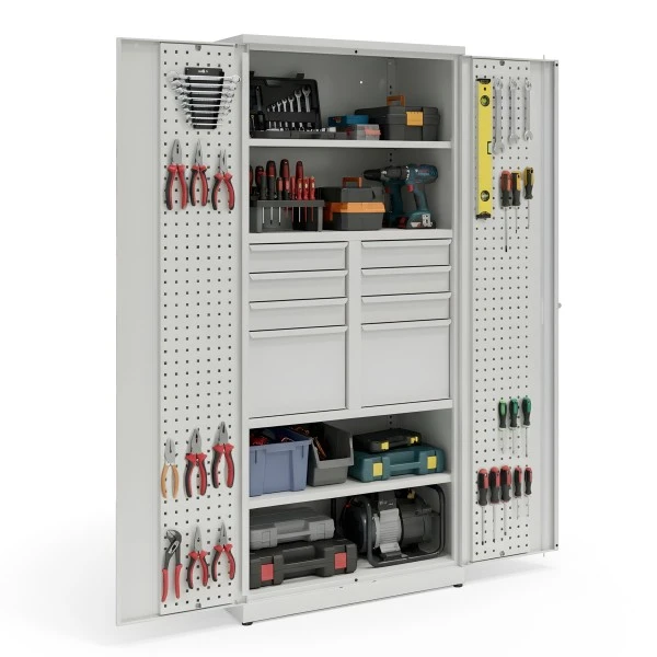 Szafa narzędziowa z 2 półkami przestawnymi, 6 szufladami wys. 100mm, 2 szufladami wys. 300mm i panelami perforowanymi na drzwiach