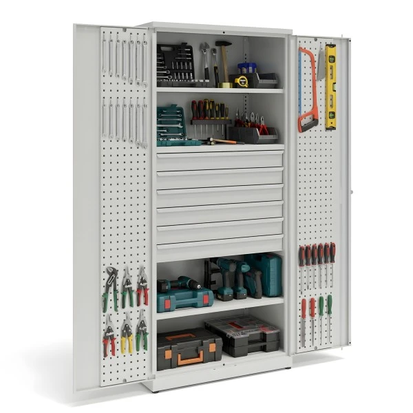 Szafa narzędziowa z 2 półkami przestawnymi, 6 szufladami wys. 100mm i panelami perforowanymi na drzwiach