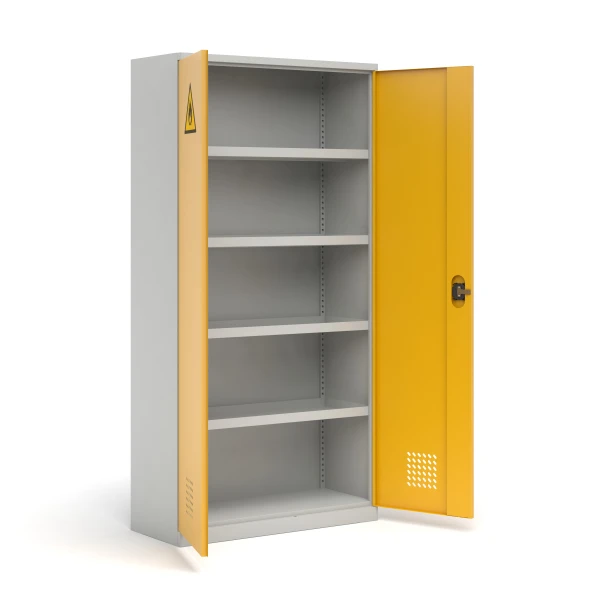 - 4 przestawne pełne półki z blachy ocynkowanej z obrzeżami wokół, zabezpieczającymi przed wylaniem się niebezpiecznych substancji poza wnętrze szafy.
