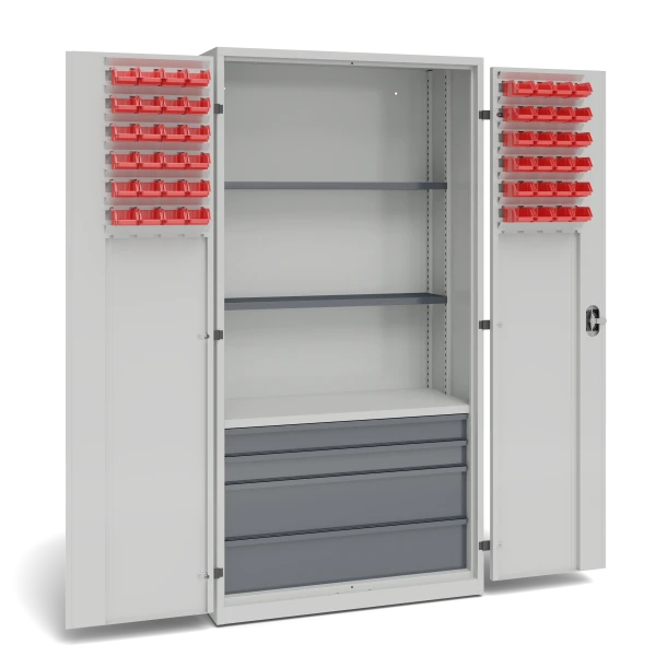 Szafa warsztatowa z 2 przestawnymi półkami, 1 półką stałą, 2 szufladami o wys. 100 mm, 2 szufladami o wys. 200 mm oraz pojemnikami na drzwiach 24 szt. PW5