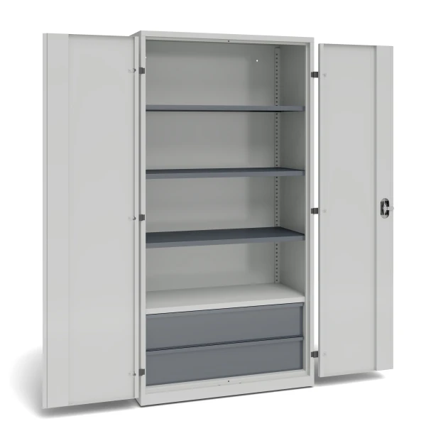 Szafa warsztatowa z 3 przestawnymi półkami, 1 półką stałą, 2 szufladami o wys. 200 mm